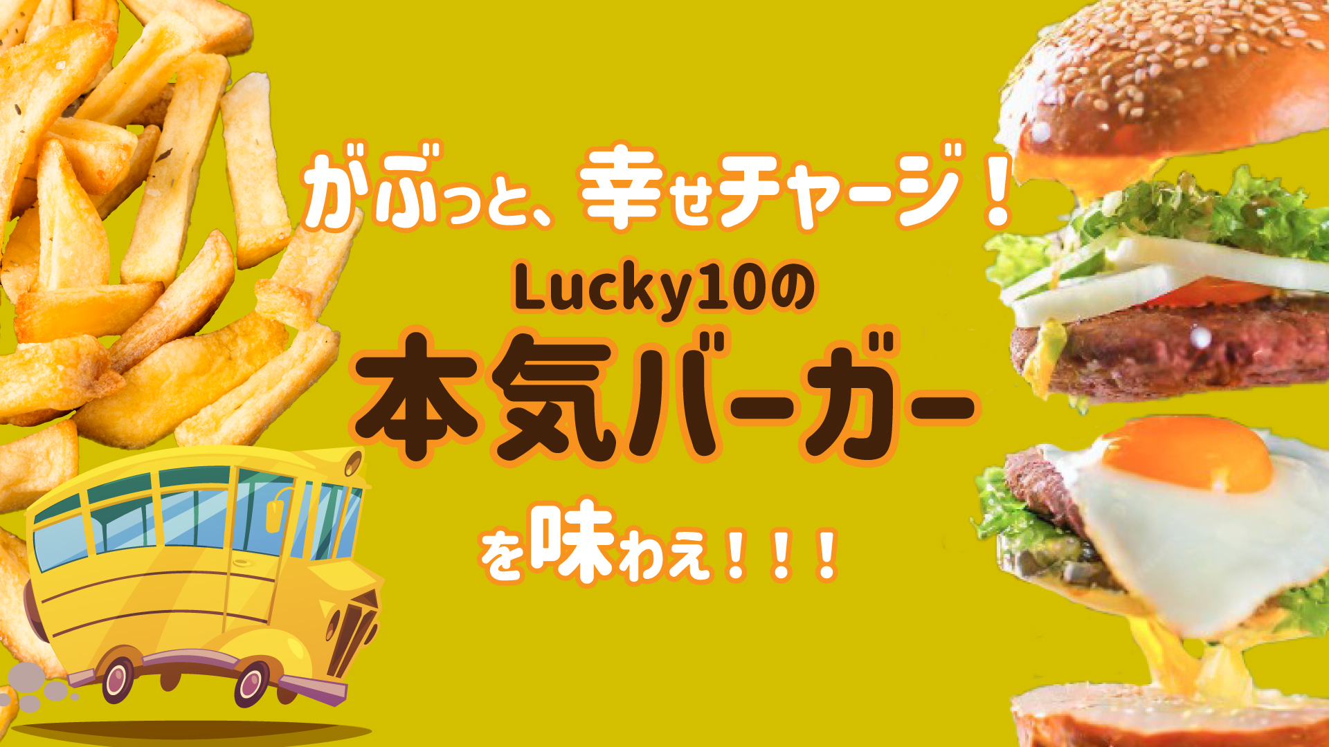 セットにすれば、幸せ倍増。Lucky10でガブっと満腹、手作りバーガーとポテトで幸せ時間。